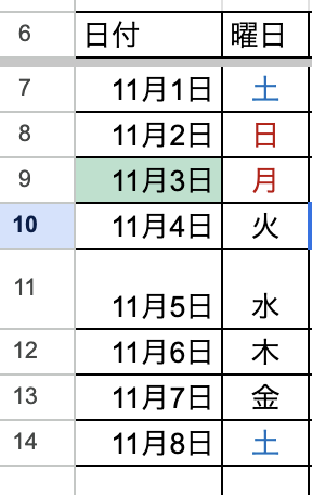 これで、スプレッドシート上のカレンダーや日付リストにおいて、今日の日付だけ自動で色がつくようになります。日付が変わると自動的に次の日に色が移動するので、毎日メンテナンスする必要はありません。